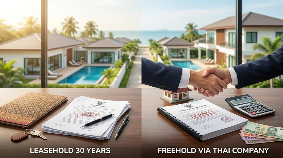 Покупатели вилл на Джомтьене сталкиваются с выбором между арендой земли (leasehold) на 30 лет и оформлением полной собственности (freehold) через тайскую компанию. Разница в стоимости может достигать 15-20%, но финальные расходы за 30 лет часто переворачивают первоначальные расчёты.