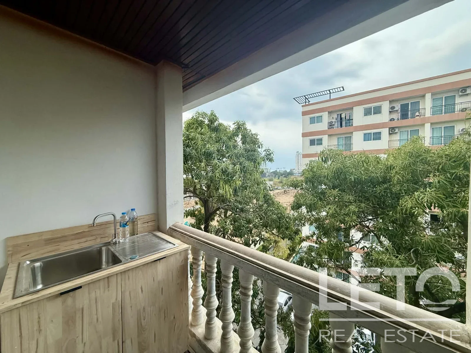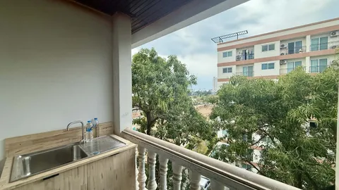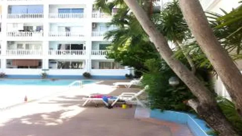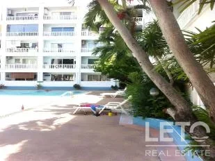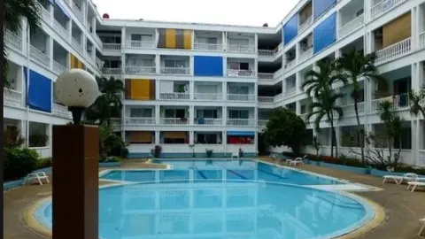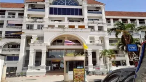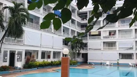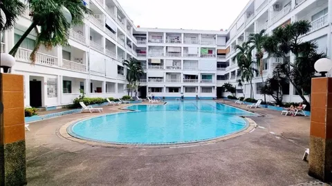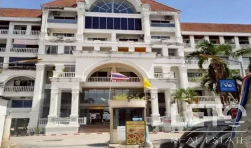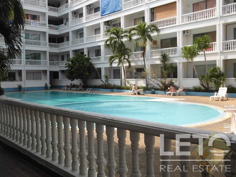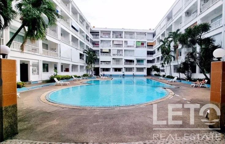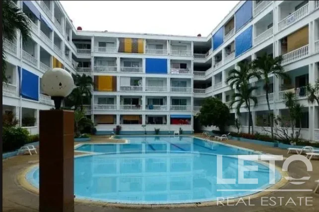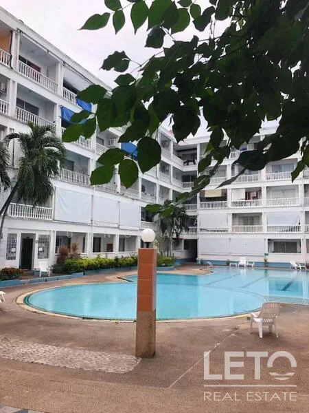 The architecture reflects the style of its era: a light-colored façade with balconies, surrounded by lush greenery and palm trees. The condominium is conveniently situated opposite the market on Soi Wat Bun (Jomtien 2nd Road), within easy reach of shops and city infrastructure.