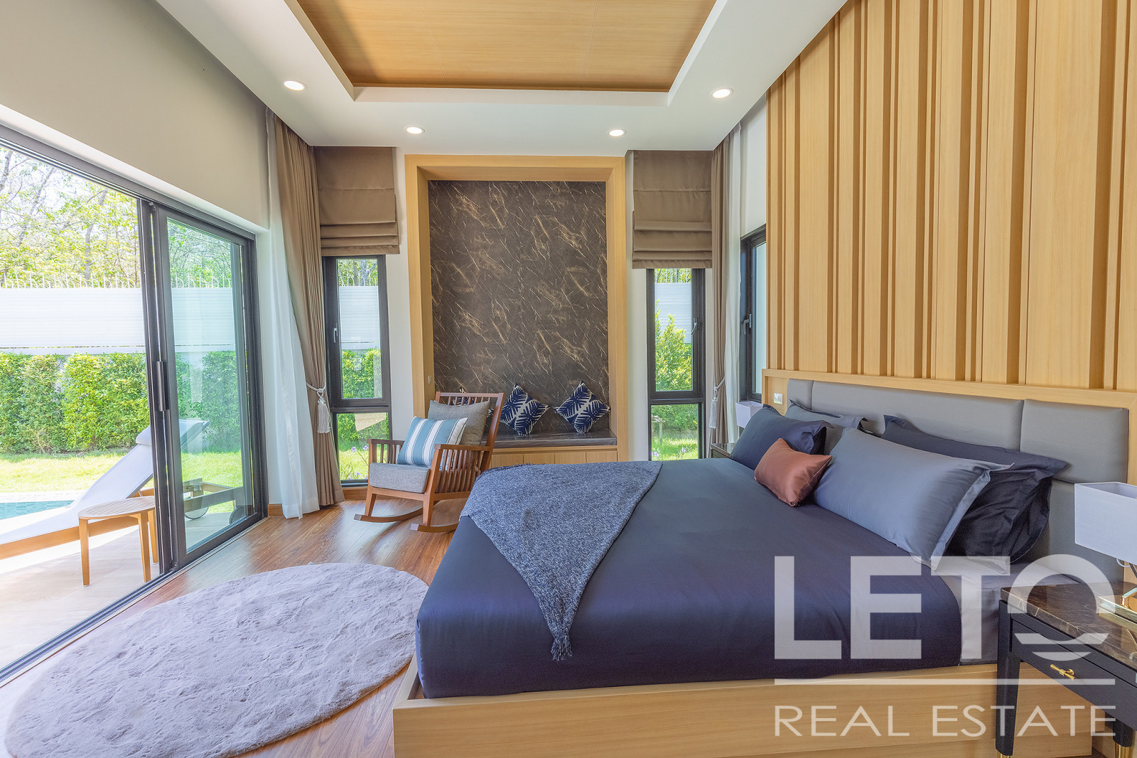 The interior and exterior spaces of the villa are thoughtfully connected, allowing guests to enjoy a secluded retreat on the poolside terrace or fully unwind in the comfortable living room.