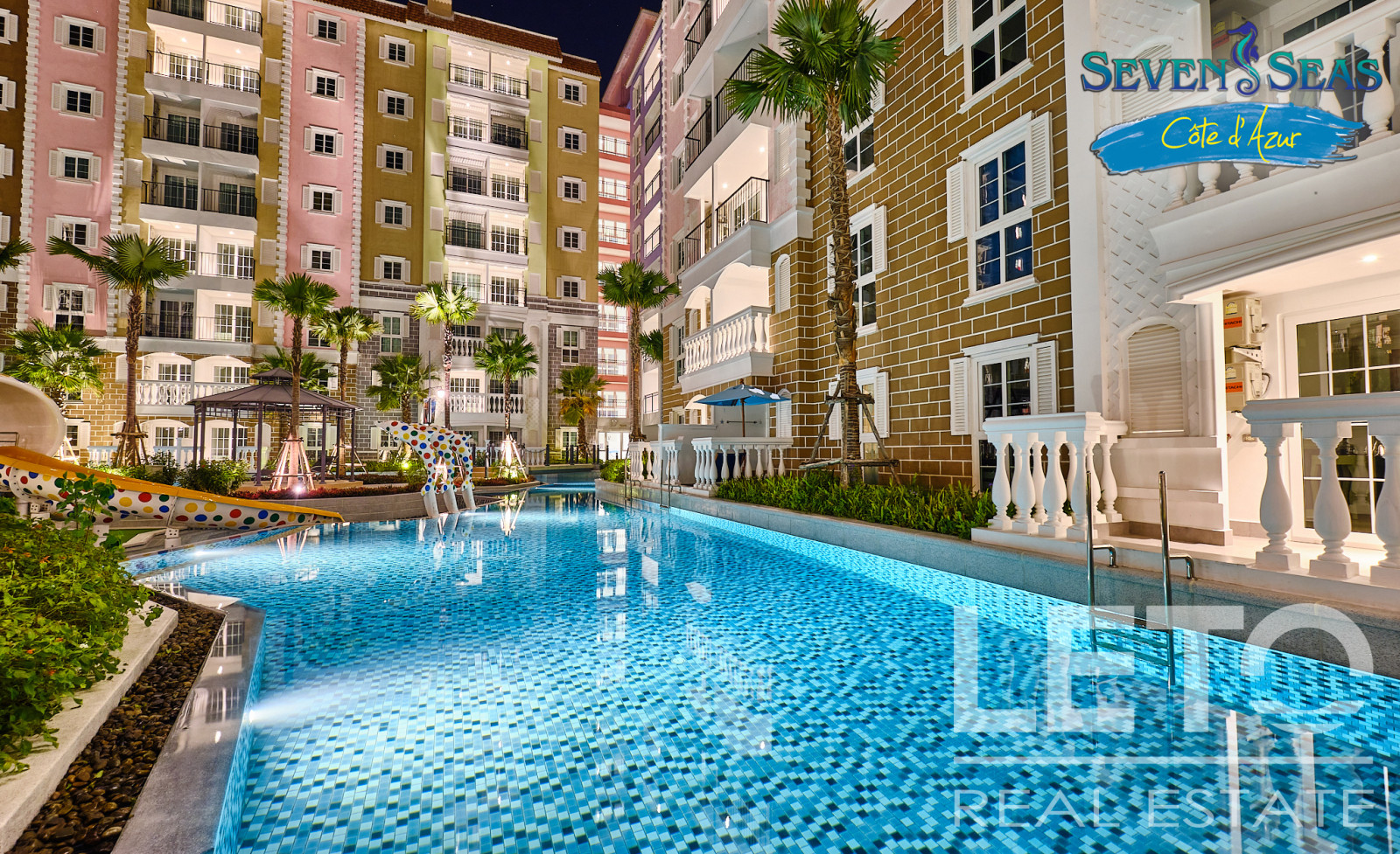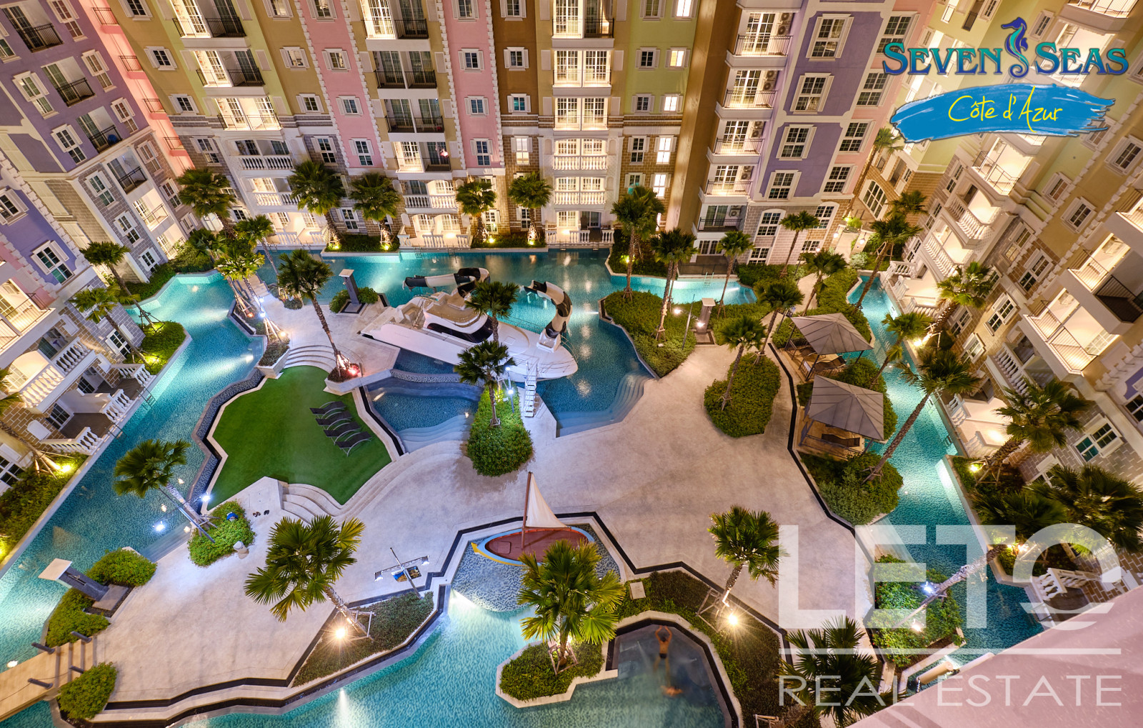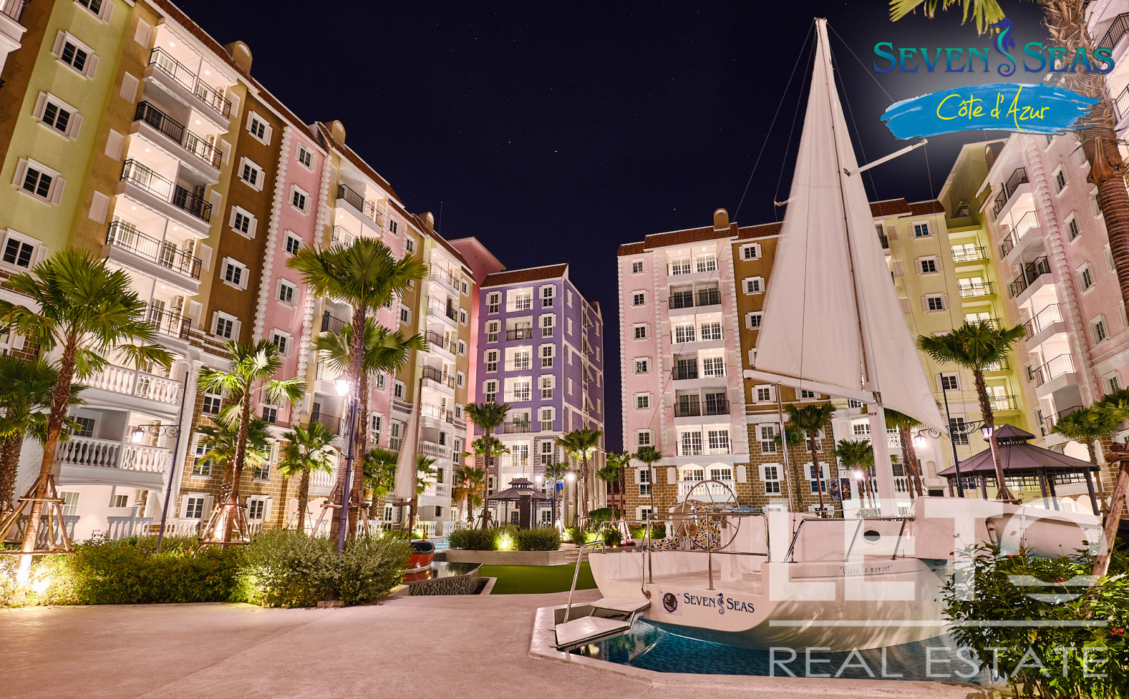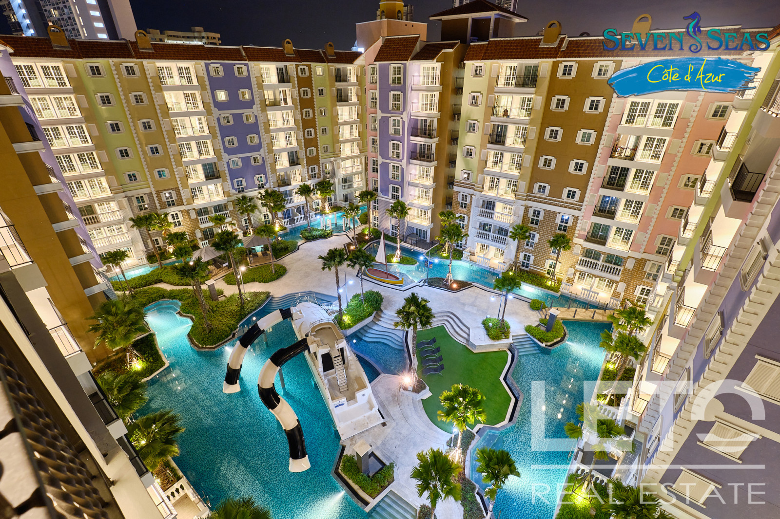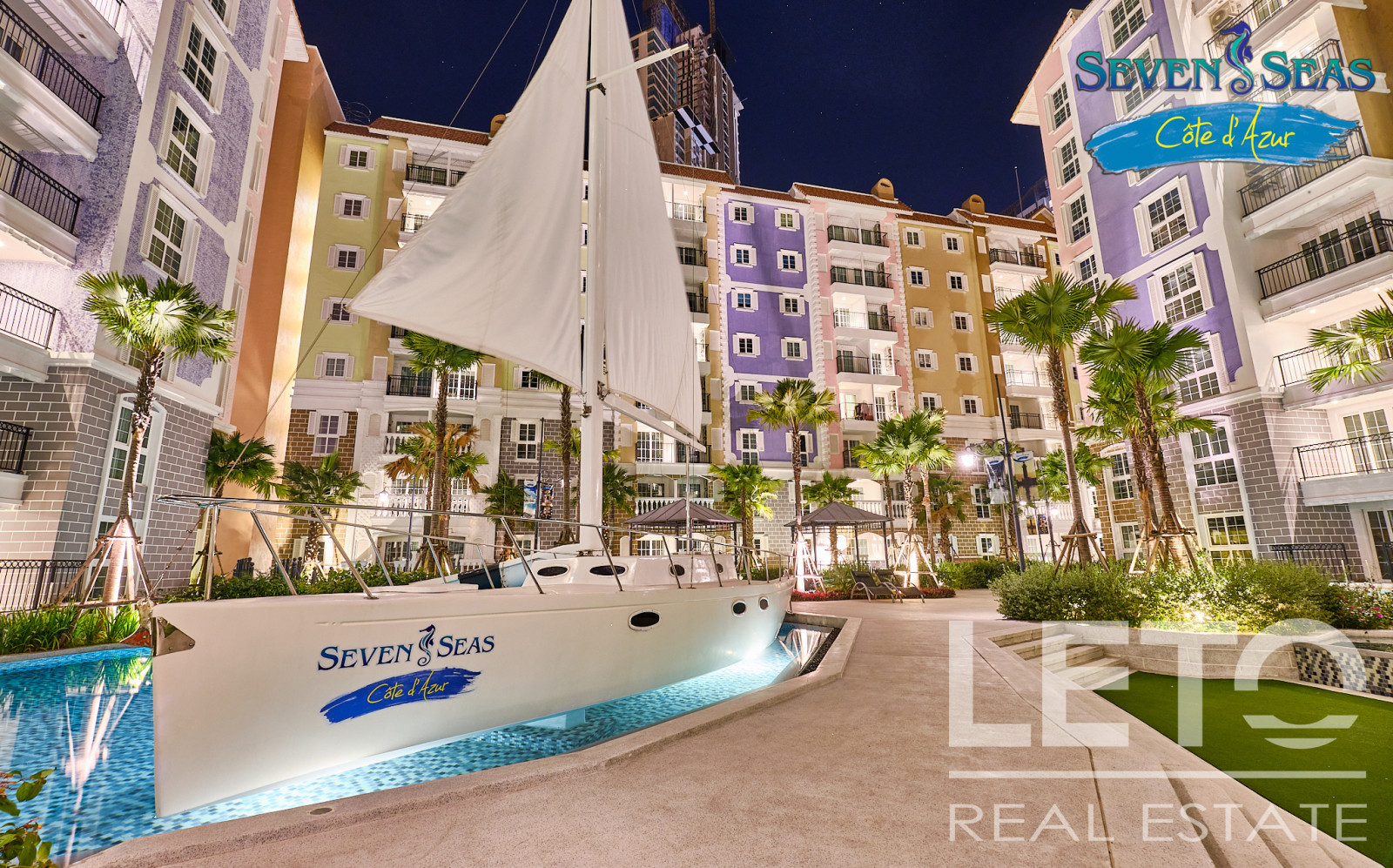 Новый резорт Seven Seas Cote d'Azur - это готовый кондоминиум от известного тайского застройщика Universal Group. Это целый город во французском стиле с богатой инфраструктурой и расположением всего в 300 м от моря на побережье Сиамского залива. Продуманный до мелочей кондоминиум класса резорт, Côte d'Azur воссоздает атмосферу самого известного и дорогого средиземноморского курорта, концепция проекта во всем: в планировке, в экстерьере зданий, в интерьерах и деталях ландшафтного дизайна и декоративных элементов инфраструктуры комплекса.