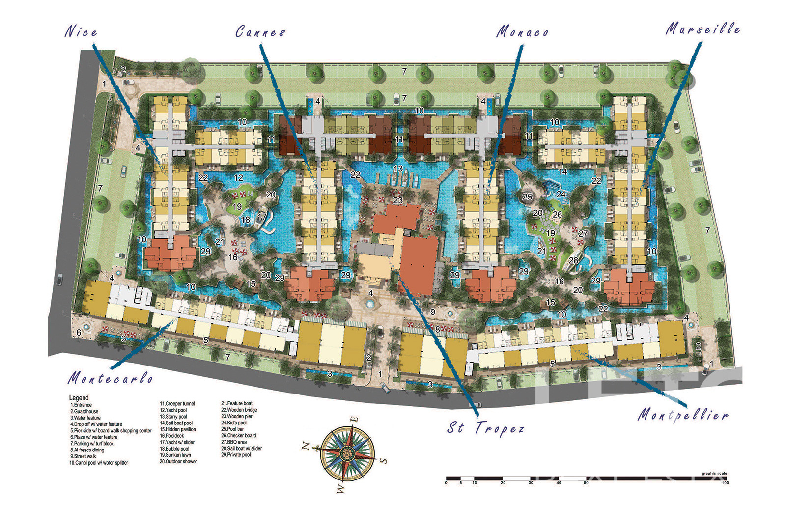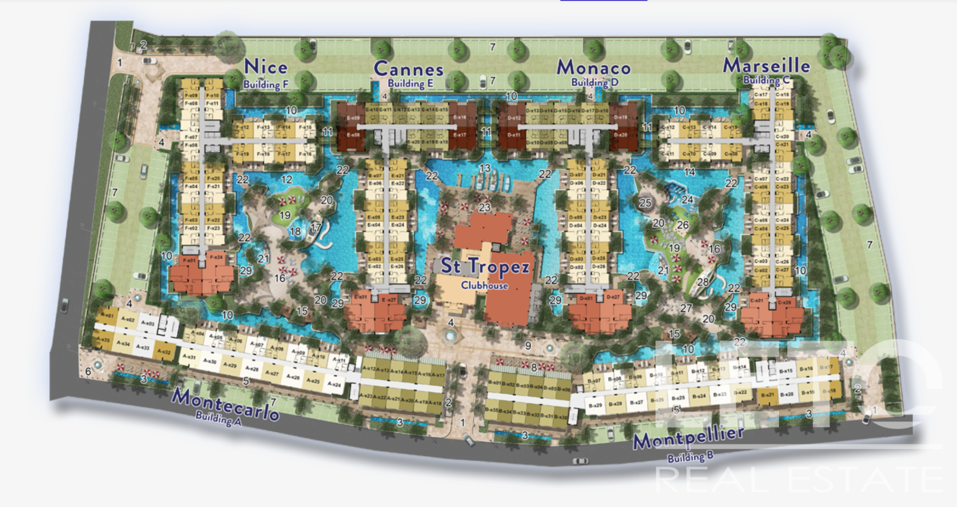 Кондоминиум на 1308 квартир представляет собой комплекс, состоящий из шести 8-этажных корпусов жилого и коммерческого предназначения, а также объектов внешней инфраструктуры на территории (бассейны, каналы, мосты, бар, прогулочные зоны, зоны отдыха и т. д.), исполненных в тематическом ключе, максимально передающем стиль Лазурного берега Франции. Каждый корпус имеет собственное наименование, соответствующее названию красивейших городов Ривьеры – «Ницца», «Канны», «Монако», «Марсель», «Монпелье», «Сен-Тропе» и «Монте-Карло»