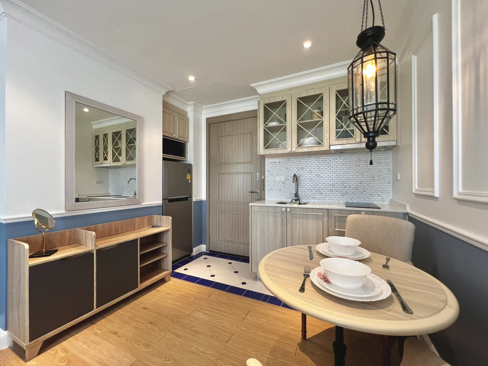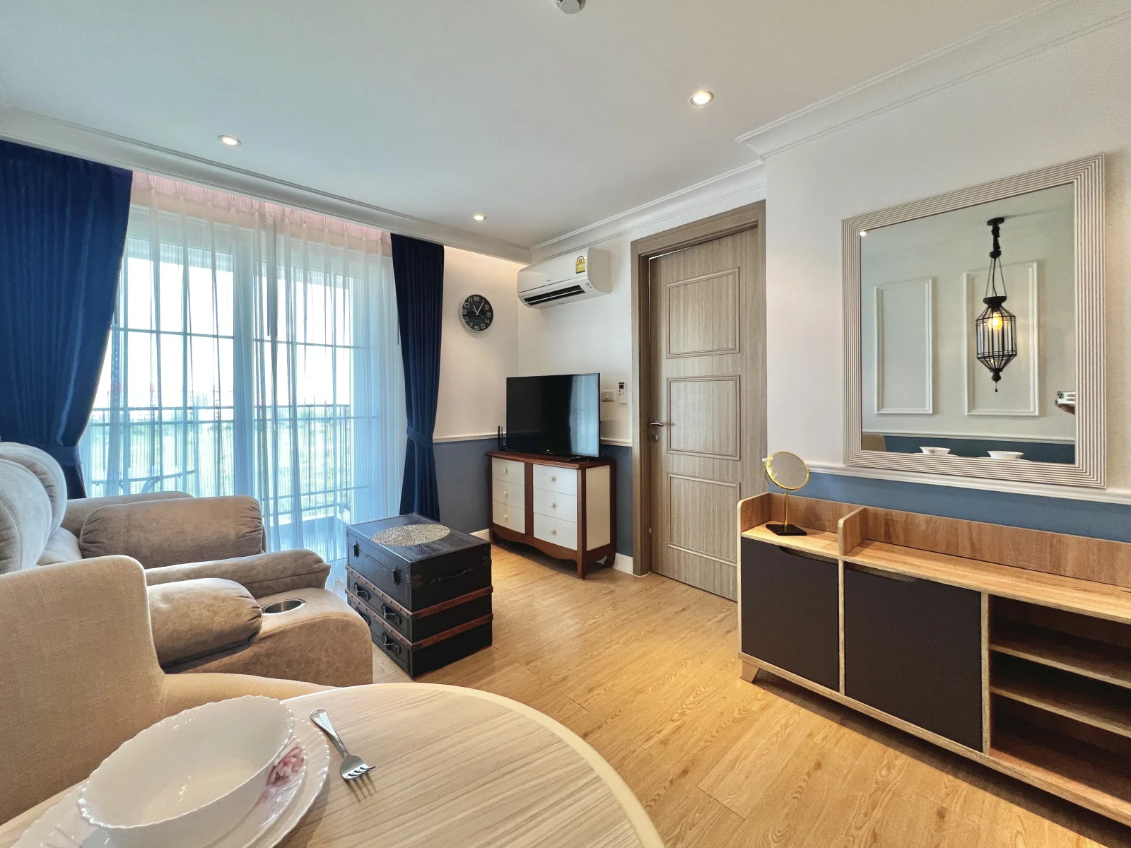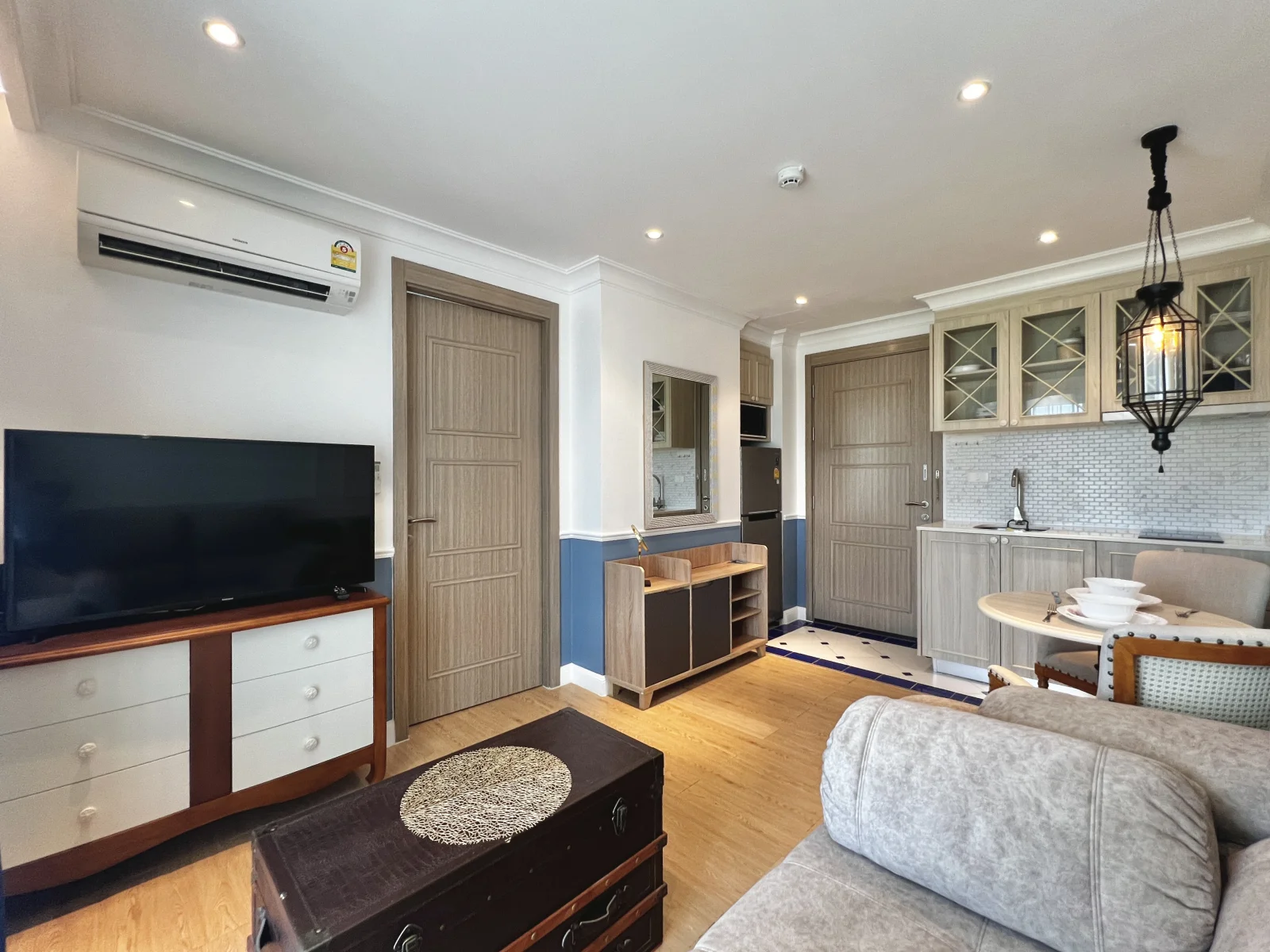 На продажу квартира с потрясающим видом на красивую территорию и бассейн, она оформлена с утонченной роскошью в мягких, радующих глаз цветах, удобной мебелью и качественной отделкой. Покупателям предоставляется пакет мебели в подарок, что позволит им избавить себя от трудоемкого процесса подбора мебели. Кухня включает в себя холодильник, раковину, встроенные кухонные шкафы, электроплиту и вытяжку. В ванной комнате проектом предусмотрены: встроенный обогреватель, душевая, умывальник и туалет. В гостевой комнате будет располагаться мягкий диван, телевизионная тумба с плоскоэкранным телевизором, кофейный столик, обеденный стол, встроенный настенный кондиционер. В спальне будет находиться двуспальная спальная кровать и матрац, прикроватный столик, элементы декора на стене, встроенный шкаф и подставка для телевизора.