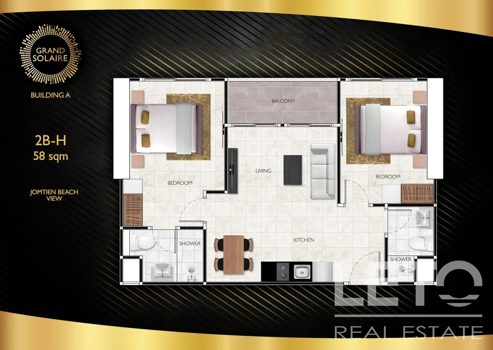 Все 2 326 предлагаемых роскошных резиденций имеют самые современные элементы дизайна интерьера, в том числе декадентскую плитку под мрамор, роскошные кухни из черного мрамора и стекла, а также первоклассную сантехнику и фурнитуру. Наслаждайтесь непревзойденной роскошью в собственном доме с электронными сантехническими системами и специально разработанными компактными и энергосберегающими кондиционерами. В дополнение к ряду кондоминиумов с 1, 2 и 3 спальнями, на верхних этажах Grand Solaire Pattaya есть ряд премиальных представительских люксов с частными бассейнами и различные дополнительные улучшения только для самых взыскательных покупателей. На вершине роскоши находится наш гигантский двухуровневый пентхаус на крыше с 5 спальнями с ванными комнатами, собственным кинотеатром и игровой комнатой — самый большой кондоминиум в Паттайской недвижимости общей площадью 1260 квадратных метров.