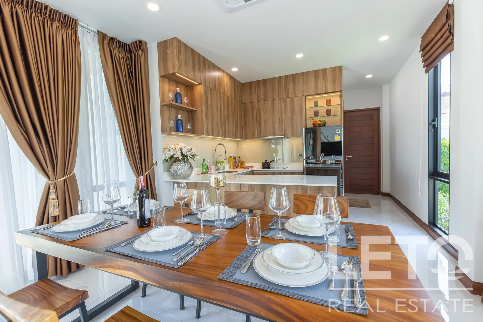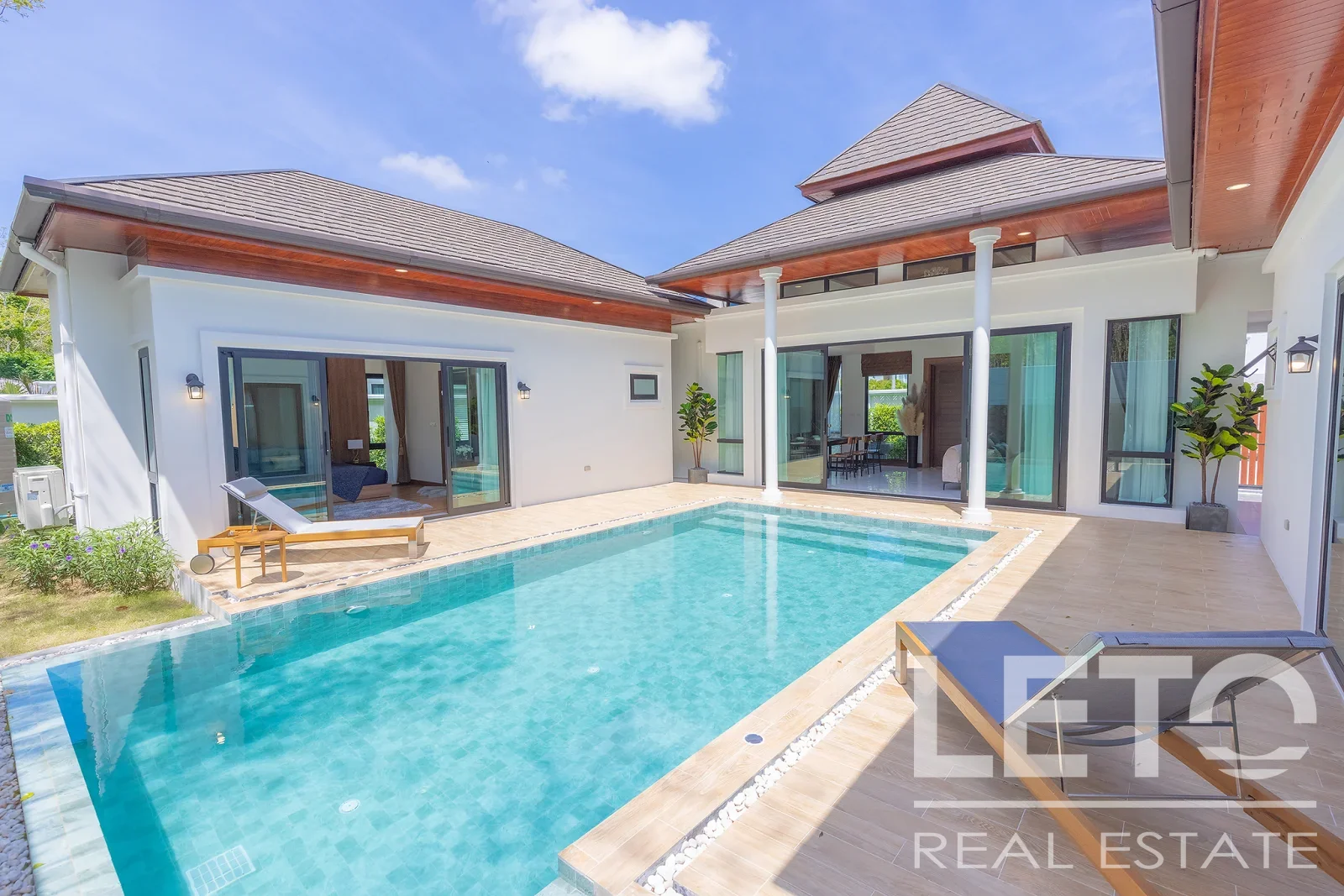 Внутренние и внешние пространства виллы соединены наилучшим образом, позволяя гостям наслаждаться уединенным отдыхом на террасе у бассейна или в полной мере расслабиться в комфортабельной гостиной.