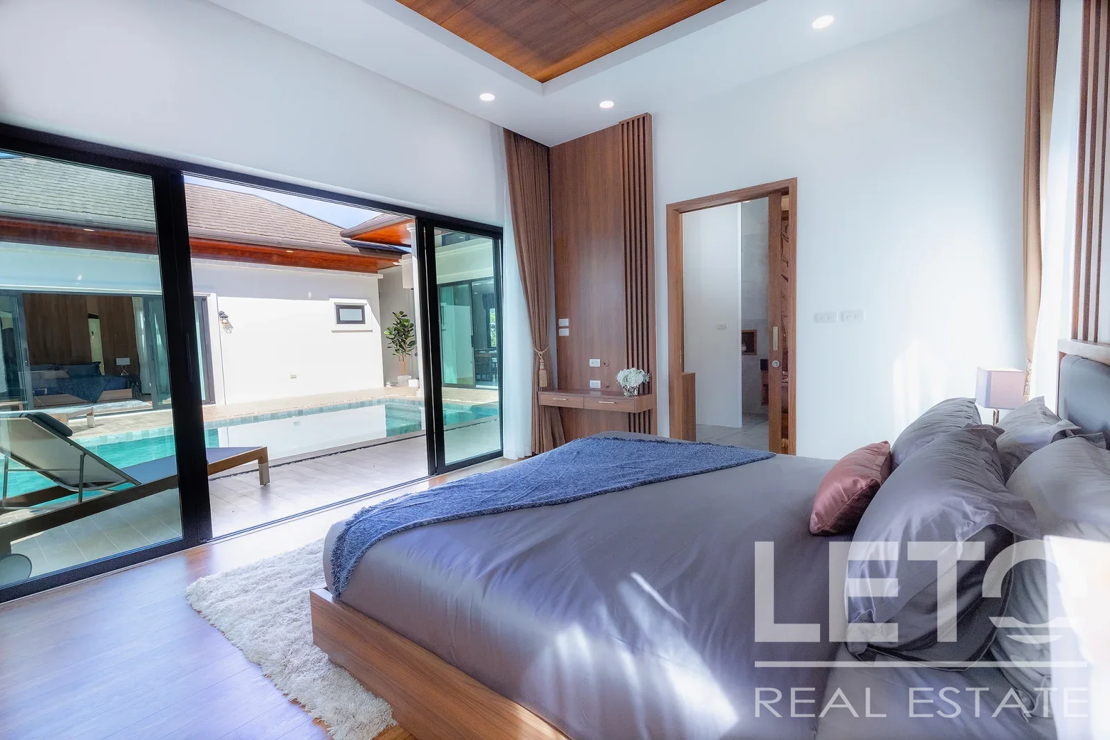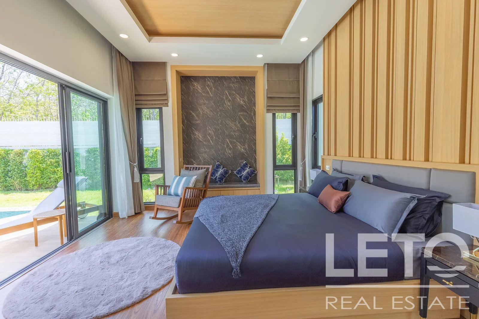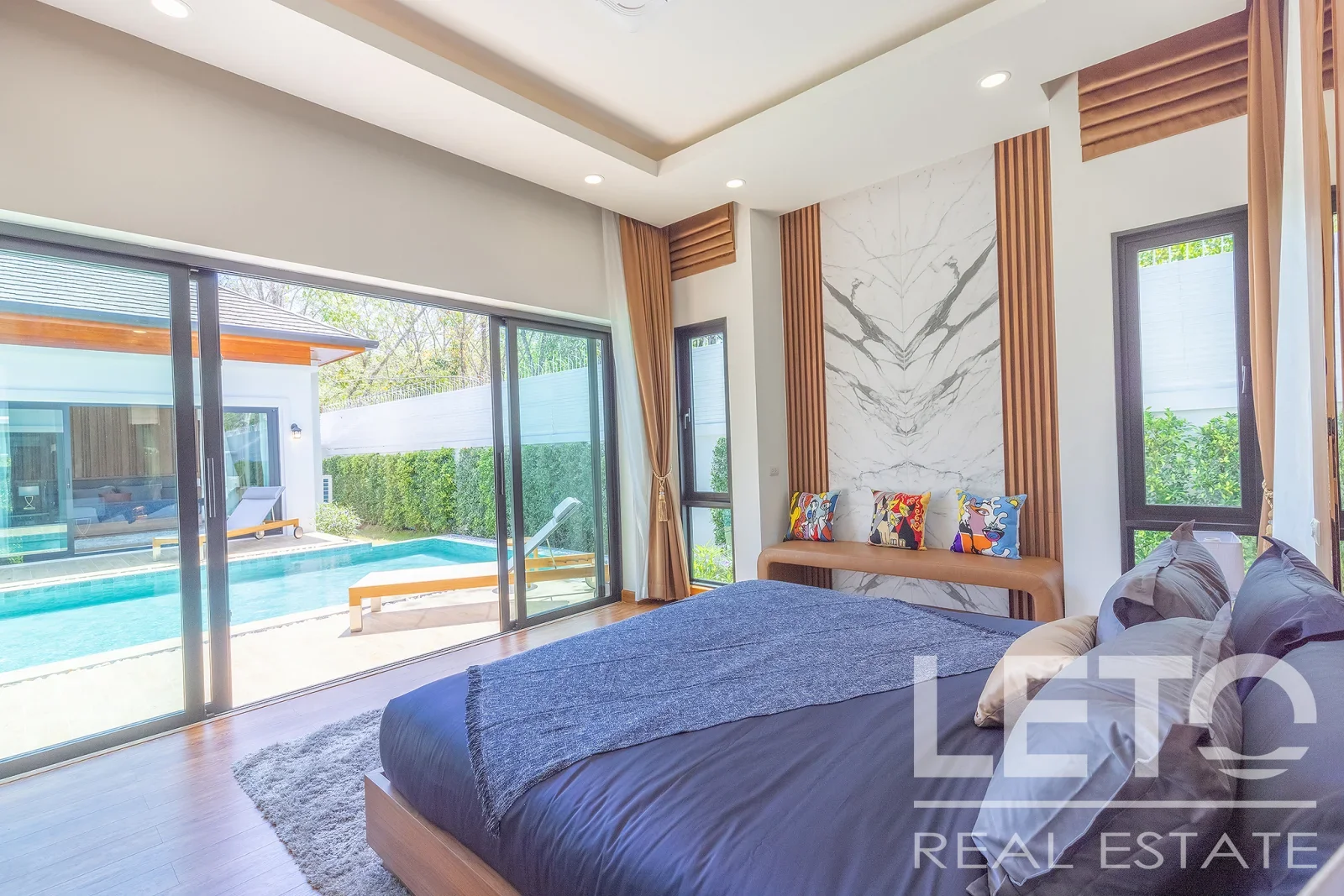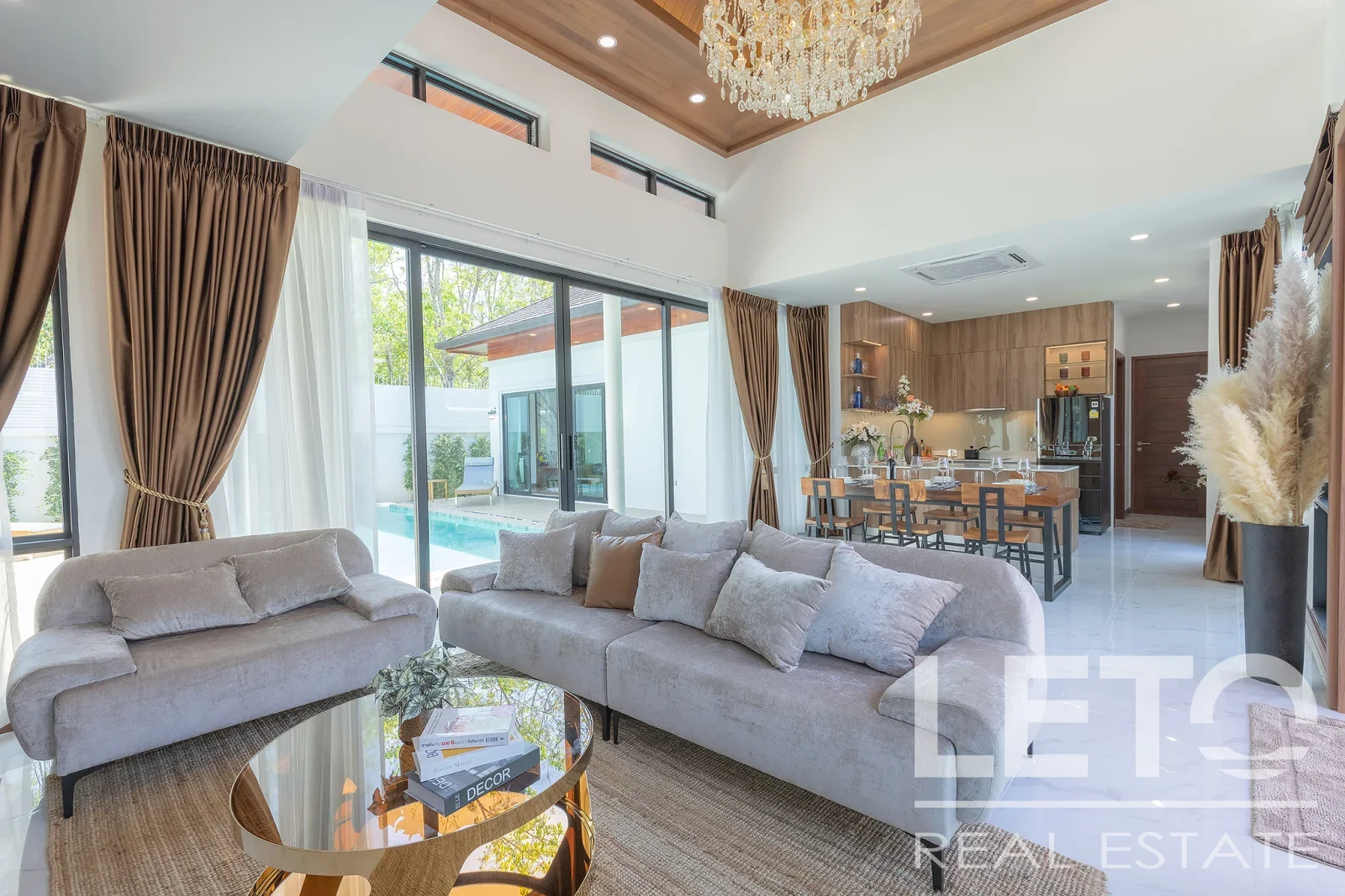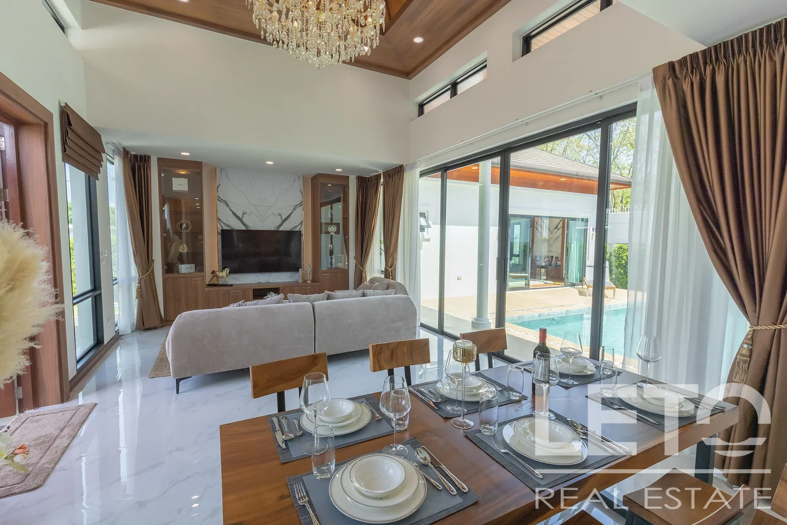 Из панорамных окон гостиной открывается вид на внутренний двор с бассейном, что создает приятную атмосферу релакса.